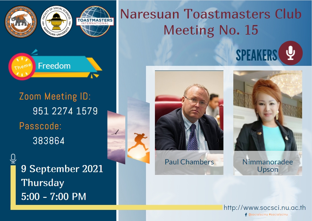 คณะสังคมศาสตร์ มหาวิทยาลัยนเรศวร ขอเชิญผู้สนใจทุกท่านร่วมโครงการ NU Toastmasters Club ครั้งที่ 15