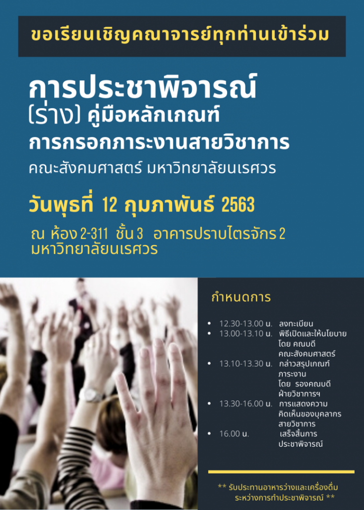 :: การทำประชาพิจารณ์ (ร่าง) คู่มือหลักเกณฑ์การกรอกภาระงานสายวิชาการ :: เรียนเชิญคณาจารย์คณะสังคมศาสตร์ทุกท่านให้เข้าร่วมการทำประชาพิจารณ์ (ร่าง) คู่มือหลักเกณฑ์การกรอกภาระงานสายวิชาการ คณะสังคมศาสตร์ มหาวิทยาลัยนเรศวร วันพุธที่ 12 กุมภาพันธ์ 2563 เวลา 13.30-16.30 น. ณ ห้องปราบไตรจักร 2-311 ชั้น 3 อาคารปราบไตรจักร 2 มหาวิทยาลัยนเรศวร