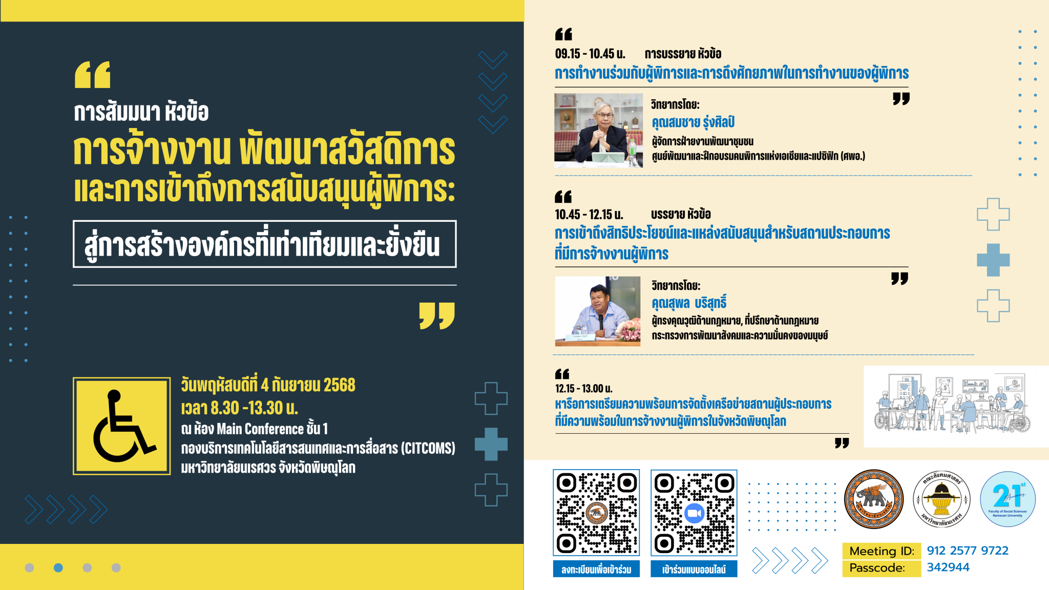 • “การเข้าถึงสิทธิประโยชน์และการสนับสนุนสำหรับสถานประกอบการที่มีการจ้างงานผู้พิการ” โดย คุณสุพล บริสุทธิ์ ที่ปรึกษาด้านกฎหมาย กระทรวงการพัฒนาสังคมและความมั่นคงของมนุษย์