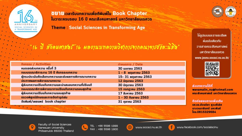 ขยายระยะเวลารับบทความเพื่อตีพิมพ์ใน book chapter ในวาระครบรอบ 16 ปี คณะสังคมศาสตร์ มหาวิทยาลัยนเรศวร