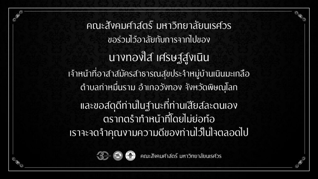 ขอร่วมไว้อาลัยกับการจากไปของ นางทองใส เศรษฐสูงเนิน เจ้าหน้าที่ อสม.ประจำหมู่บ้านเนินมะเกลือ คณะสังคมศาสตร์ มหาวิทยาลัยนเรศวร ขอร่วมไว้อาลัยกับการจากไปของ นางทองใส เศรษฐสูงเนิน เจ้าหน้าที่อาสาสมัครสาธารณสุขประจำหมู่บ้านเนินมะเกลือ ตำบลท่าหมื่นราม อำเภอวังทอง จังหวัดพิษณุโลก และขอสดุดีท่านในฐานะที่ท่านเสียสละตนเอง ตรากตรำทำหน้าที่โดยไม่ย่อท้อ เราจะจดจำคุณงามความดีของท่านไว้ในใจตลอดไป