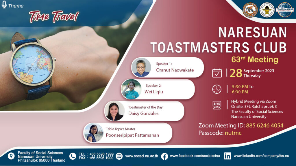 คณะสังคมศาสตร์ มหาวิทยาลัยนเรศวร ขอเชิญผู้สนใจทุกท่านร่วมโครงการ NU Toastmasters Club ครั้งที่ 62