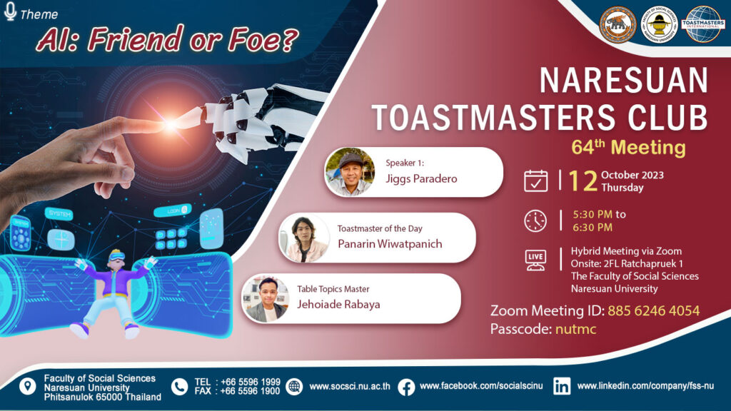 คณะสังคมศาสตร์ มหาวิทยาลัยนเรศวร ขอเชิญผู้สนใจทุกท่านร่วมโครงการ NU Toastmasters Club ครั้งที่ 62
