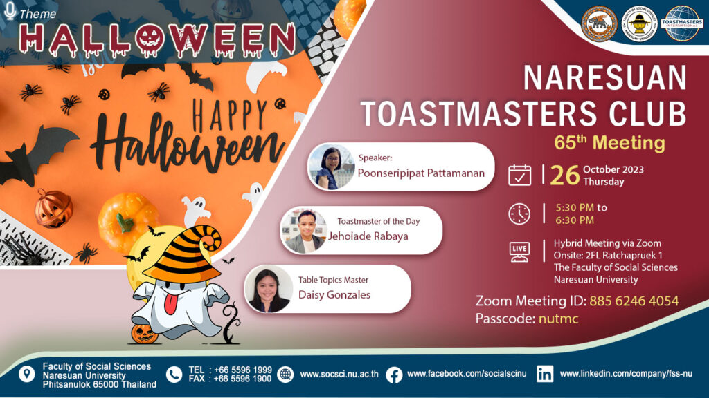 คณะสังคมศาสตร์ มหาวิทยาลัยนเรศวร ขอเชิญผู้สนใจทุกท่านร่วมโครงการ NU Toastmasters Club ครั้งที่ 65