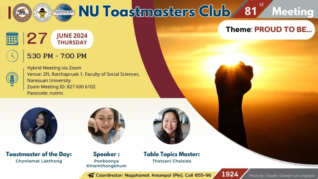 คณะสังคมศาสตร์ มหาวิทยาลัยนเรศวร ขอเชิญผู้สนใจทุกท่านร่วมโครงการ NU Toastmasters Club ครั้งที่ 80