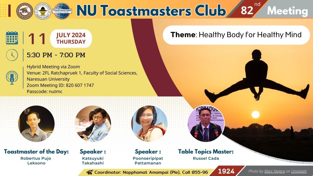 คณะสังคมศาสตร์ มหาวิทยาลัยนเรศวร ขอเชิญผู้สนใจทุกท่านร่วมโครงการ NU Toastmasters Club ครั้งที่ 82