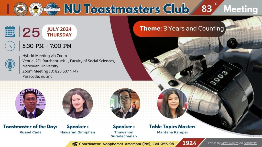 คณะสังคมศาสตร์ มหาวิทยาลัยนเรศวร ขอเชิญผู้สนใจทุกท่านร่วมโครงการ NU Toastmasters Club ครั้งที่ 83