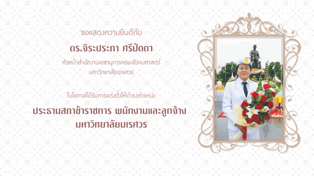 ขอแสดงความยินดีกับ ดร.จิระประภา ศรีปัตตา หัวหน้าสำนักงานเลขานุการคณะสังคมศาสตร์ มหาวิทยาลัยนเรศวร ในโอกาสได้รับการแต่งตั้งให้ดำรงตำแหน่ง ประธานสภาข้าราชการ พนักงานและลูกจ้าง มหาวิทยาลัยนเรศวร