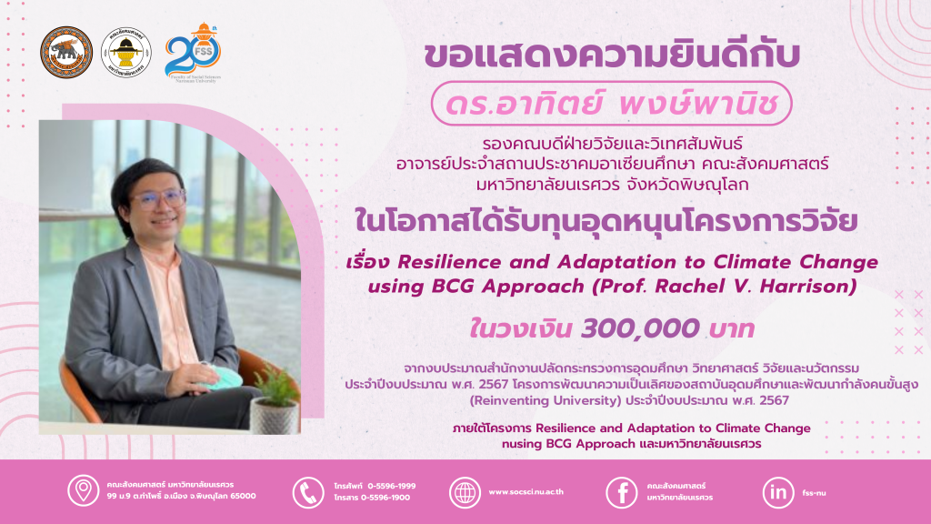 ขอแสดงความยินดีกับ ดร.อาทิตย์ พงษ์พานิช รองคณบดีฝ่ายวิเทศสัมพันธ์ อาจารย์ประจำสถานประชาคมอาเซียนศึกษา คณะสังคมศาสตร์ มหาวิทยาลัยนเรศวรในการได้รับทุนอุดหนุนโครงการวิจัย เรื่อง “Resilience and Adaptation to Climate Change using BCG Approach” (Prof. Rachel V. Harrison) ในวงเงิน 300,000 บาท