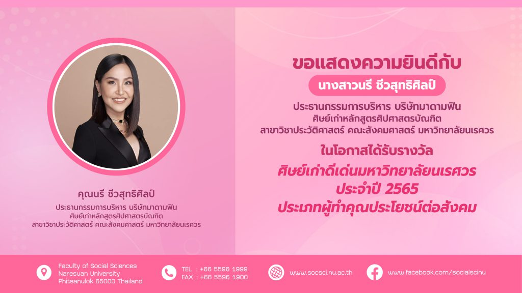 ขอแสดงความยินดีกับ นางสาวนรี ชีวสุทธิศิลป์ ประธานกรรมการ​บริหาร บริษัท​มาดามฟิน ศิษย์เก่าหลัก​สูตร​ศิลปศาสตรบัณ​ฑิต สาขาวิชาประวัติศาสตร์ คณะส​ังคมศาสตร์​ มหาวิทยาลัยนเรศวร ในโอกาสได้รับรางวัล ศิษย์เก่าดีเด่นมหาวิทยาลัยนเรศวร ประจำปี 2565 ประเภทผู้ทำคุณประโยชน์ต่อสังคม