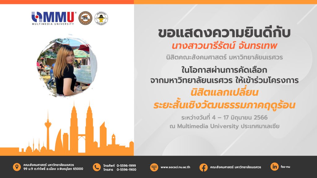 ขอแสดงความยินดีกับ นางสาวนารีรัตน์ จันทรเทพ นิสิตคณะสังคมศาสตร์ มหาวิทยาลัยนเรศวร ในโอกาสผ่านการคัดเลือก จากมหาวิทยาลัยนเรศวร ให้เข้าร่วมโครงการ นิสิตแลกเปลี่ยนระยะสั้นเชิงวัฒนธรรมภาคฤดูร้อน ณ Multimedia University ประเทศมาเลเซีย