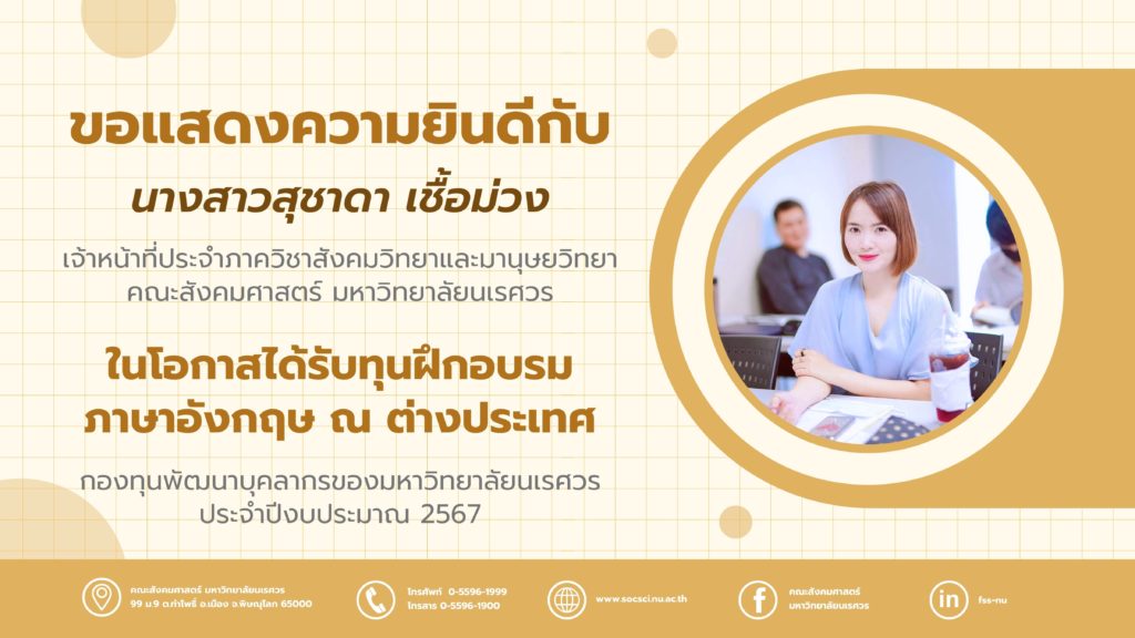 ขอแสดงความยินดีกับ นางสาวสุชาดา เชื้อม่วง เจ้าหน้าที่ประจำภาควิชาสังคมวิทยาและมานุษยวิทยา คณะสังคมศาสตร์ มหาวิทยาลัยนเรศวร ในโอกาสได้รับทุนฝึกอบรมภาษาอังกฤษ ณ ต่างประเทศ
