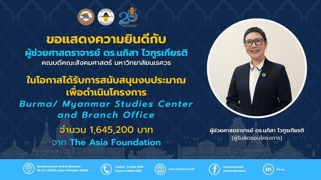 ขอแสดงความยินดีกับ ผู้ช่วยศาสตราจารย์ ดร.นภิสา ไวฑูรเกียรติคณบดีคณะสังคมศาสตร์ มหาวิทยาลัยนเรศวร ในโอกาสได้รับการสนับสนุนงบประมาณเพื่อดำเนินโครงการ Burma/ Myanmar Studies Center and Branch Office