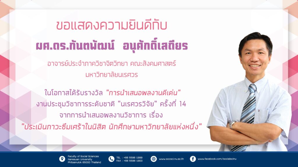 ขอแสดงความยินดีกับ ผู้ช่วยศาสตราจารย์ ดร.กันตพัฒน์ อนุศักดิ์เสถียร ในโอกาสได้รับรางวัล “การนำเสนอผลงานดีเด่น” งานประชุมวิชาการระดับชาติ “นเรศวรวิจัย” ครั้งที่ 14