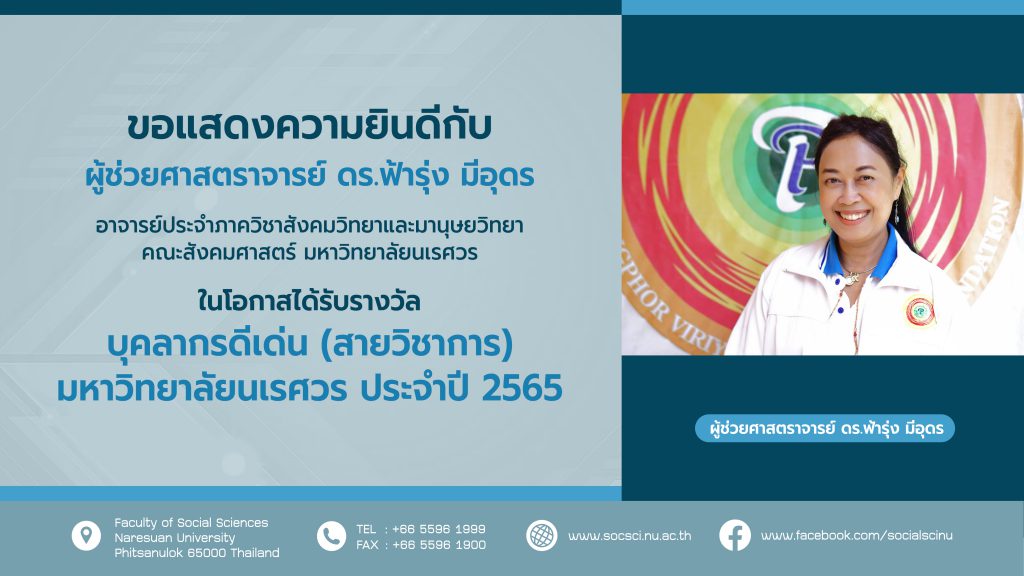ขอแสดงความยินดีกับ ผู้ช่วยศาสตราจารย์ ดร.ฟ้ารุ่ง มีอุดร อาจารย์ประจำภาควิชาสังคมวิทยาและมานุษยวิทยา คณะสังคมศาสตร์ มหาวิทยาลัยนเรศวร ในโอกาสได้รับรางวัล บุคลากรดีเด่น (สายวิชาการ) มหาวิทยาลัยนเรศวร ประจำปี 2565