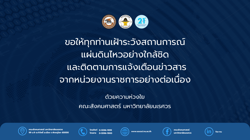 ขอให้ทุกท่านเฝ้าระวังสถานการณ์แผ่นดินไหวอย่างใกล้ชิด และติดตามข่าวสารการแจ้งเตือนจากหน่วยงานราชการอย่างต่อเนื่อง ขอให้ทุกท่านเฝ้าระวังสถานการณ์แผ่นดินไหวอย่างใกล้ชิด และติดตามการแจ้งเตือนข่าวสาร จากหน่วยงานราชการอย่างต่อเนื่องด้วยความห่วงใยคณะสังคมศาสตร์ มหาวิทยาลัยนเรศวร