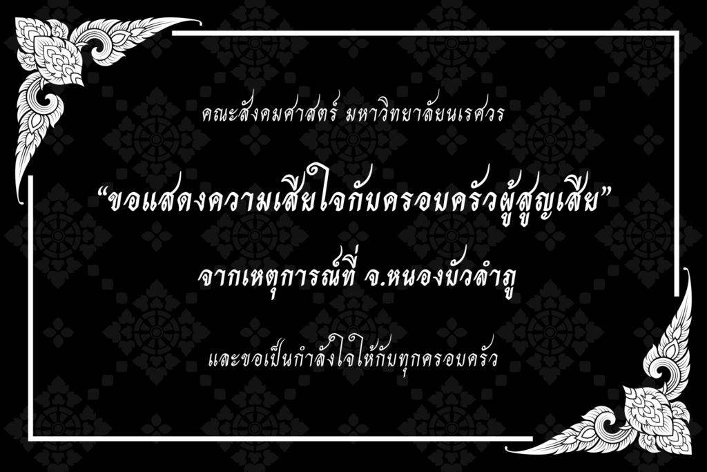 คณะสังคมศาสตร์ มหาวิทยาลัยนเรศวร จังหวัดพิษณุโลก ขอแสดงความเสียใจกับครอบครัวผู้สูญเสีย และขอเป็นกำลังใจให้กับทุกครอบครัว ผ่านพ้นช่วงเวลานี้ไปได้ด้วยดี