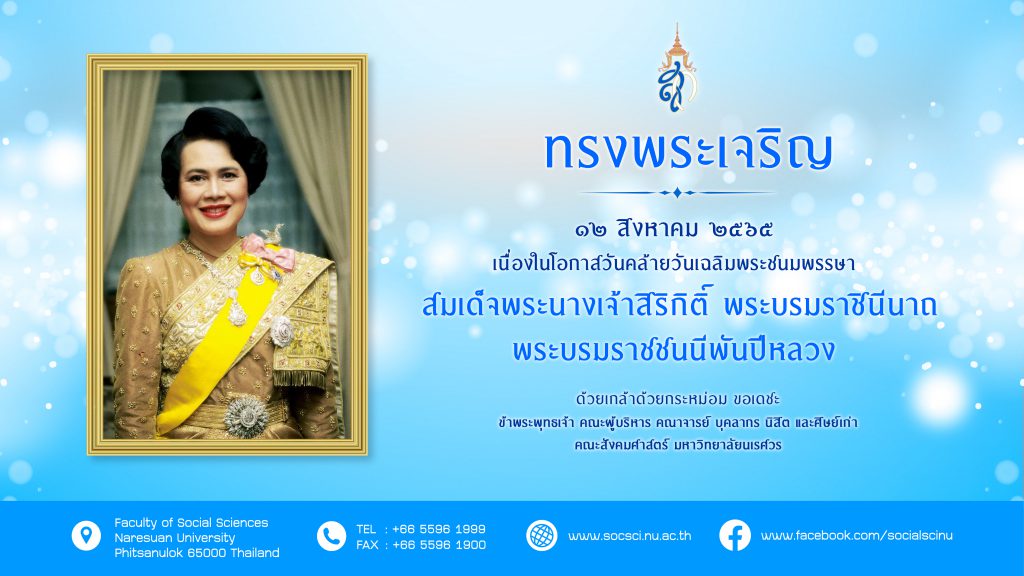 “ทรงพระเจริญ” ๑๒ สิงหาคม ๒๕๖๕ เนื่องในโอกาสวันคล้ายวันเฉลิมพระชนมพรรษา สมเด็จพระนางเจ้าสิริกิติ์ พระบรมราชินีนาถ พระบรมราชชนนีพันปีหลวง “ทรงพระเจริญ” ๑๒ สิงหาคม ๒๕๖๕ เนื่องในโอกาสวันคล้ายวันเฉลิมพระชนมพรรษา สมเด็จพระนางเจ้าสิริกิติ์ พระบรมราชินีนาถ พระบรมราชชนนีพันปีหลวง ด้วยเกล้าด้วยกระหม่อม ขอเดชะ ข้าพระพุทธเจ้า คณะผู้บริหาร คณาจารย์ บุคลากร นิสิต และศิษย์เก่า คณะสังคมศาสตร์ มหาวิทยาลัยนเรศวร