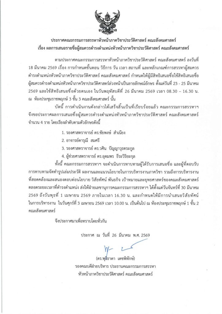 ประกาศคณะกรรมการสรรหาหัวหน้าภาควิชาประวัติศาสตร์ เรื่อง ผลการเสนอรายชื่อผู้สมควรดำรงตำแหน่งหัวหน้าภาควิชาประวัติศาสตร์ id671-1774579006_d510dcd1574860b1f33dDownload