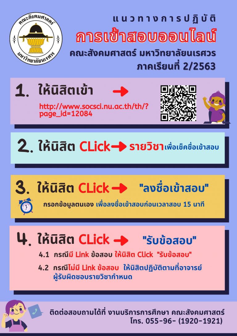 2. หากนิสิตมีข้อสงสัยหรือมีปัญหาในการ “ลงชื่อเข้าสอบ” ให้ติดต่อหน่วยเทคโนโลยีสารสนเทศ คณะสังคมศาสตร์ โทร. 0 5596 1923