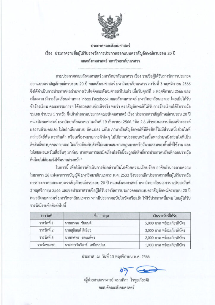 รางวัลการประกวดการออกแบบตราสัญลักษณ์ครบรอบ 20 ปี คณะสังคมศาสตร์ มหาวิทยาลัยนเรศวร