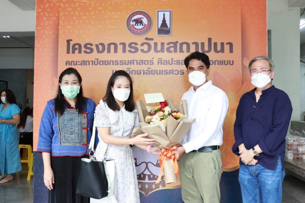 และเวลา 09.00 น. ผู้ช่วยศาสตราจารย์ ดร.อรไท โสภารัตน์ รองคณบดีฝ่ายกิจการนิสิตและศิษย์เก่าสัมพันธ์ คณะสังคมศาสตร์ มอบช่อดอกไม้เพื่อแสดงความยินดีเนื่องในวันคล้ายวันสถาปนาคณะสถาปัตยกรรมศาสตร์ ศิลปะและการออกแบบ มหาวิทยาลัยนเรศวร ประจำปี 2565 โดยมี รองศาสตราจารย์ ดร.นิรัช สุดสังข์ คณบดีคณะคณะสถาปัตยกรรมศาสตร์ ศิลปะและการออกแบบ เป็นผู้รับมอบ
