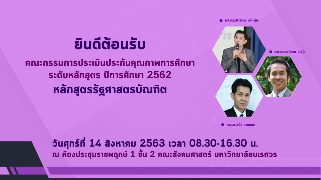 ยินดีต้อนรับคณะกรรมการประเมินประกันคุณภาพการศึกษาระดับหลักสูตร ปีการศึกษา 2562 หลักสูตรรัฐศาสตรบัณฑิต ยินดีต้อนรับคณะกรรมการประเมินประกันคุณภาพการศึกษา ระดับหลักสูตร ปีการศึกษา 2562 หลักสูตรรัฐศาสตรบัณฑิต วันศุกร์ที่ 14 สิงหาคม 2563 เวลา 08.30-16.30 น. ณ ห้องประชุมราชพฤกษ์ 1 ชั้น 2 คณะสังคมศาสตร์ มหาวิทยาลัยนเรศวร