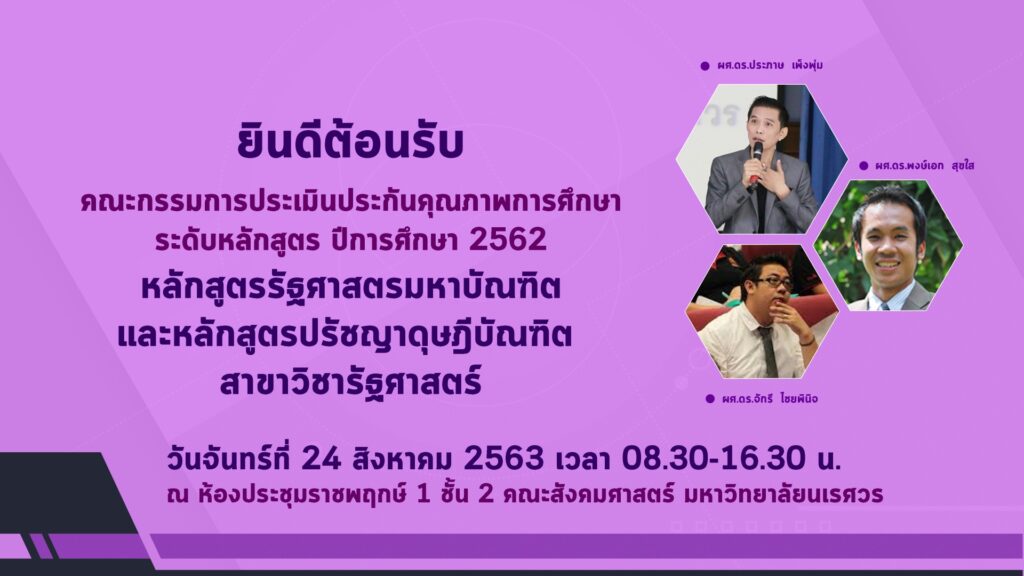 ยินดีต้อนรับคณะกรรมการประเมินประกันคุณภาพการศึกษา ระดับหลักสูตร ปีการศึกษา 2562 หลักสูตรรัฐศาสตรมหาบัณฑิต และหลักสูตรปรัชญาดุษฎีบัณฑิต สาขาวิชารัฐศาสตร์