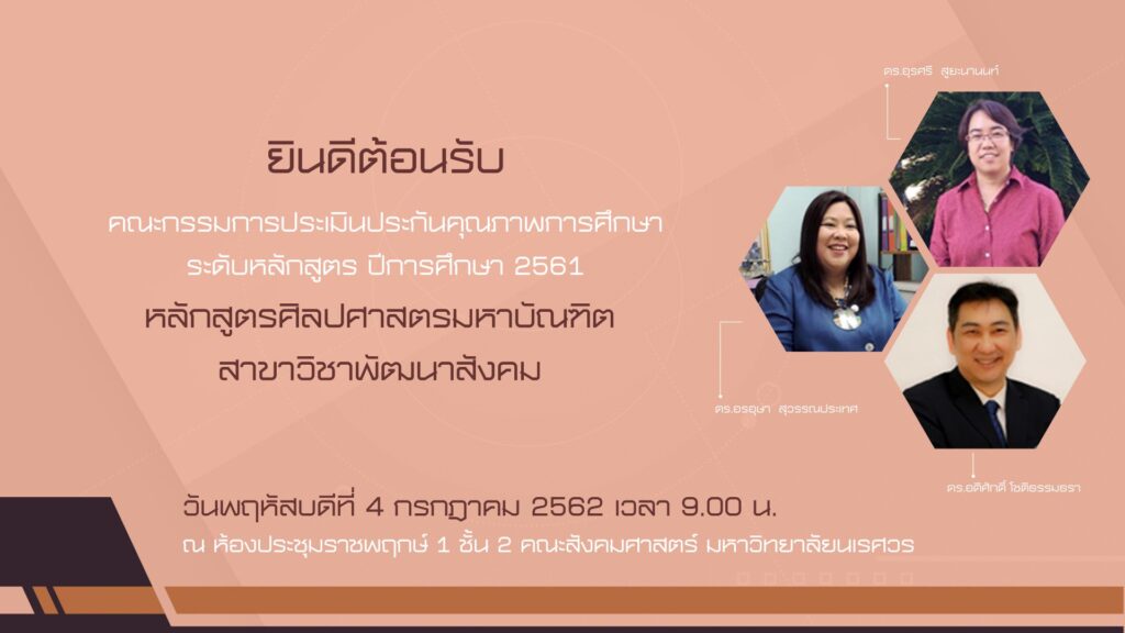 ยินดีต้อนรับคณะกรรมการประเมินประกันคุณภาพการศึกษา ระดับหลักสูตร ปีการศึกษา 2561 หลักสูตรศิลปศาสตรมหาบัณฑิต และหลักสูตรปรัชญาดุษฎีบัณฑิต สาขาวิชาพัฒนาสังคม