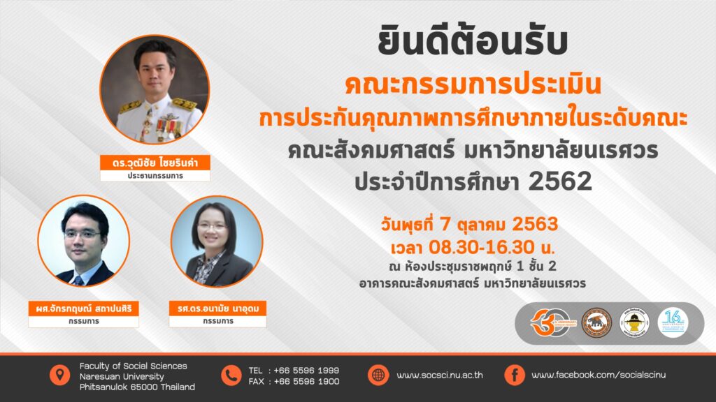 ยินดีต้อนรับคณะกรรมการประเมินการประกันคุณภาพการศึกษาภายในระดับคณะ คณะสังคมศาสตร์ มหาวิทยาลัยนเรศวร ประจำปีการศึกษา 2562 ยินดีต้อนรับ คณะกรรมการประเมินการประกันคุณภาพการศึกษาภายในระดับคณะ คณะสังคมศาสตร์ มหาวิทยาลัยนเรศวร ประจำปีการศึกษา 2562 วันพุธที่ 7 ตุลาคม 2563 เวลา 08.30-16.30 น. ณ ห้องประชุมราชพฤกษ์ 1 ชั้น 2 อาคารคณะสังคมศาสตร์ มหาวิทยาลัยนเรศวร
