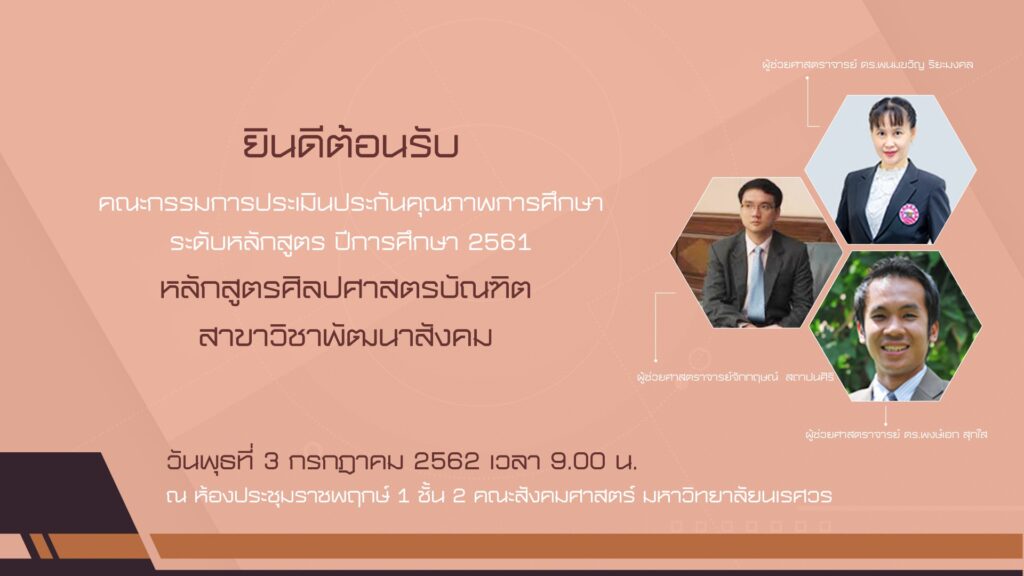 ยินดีต้อนรับคณะกรรมการประเมินประกันคุณภาพการศึกษา ระดับหลักสูตร ปีการศึกษา 2561 หลักสูตรศิลปศาสตรบัณฑิต สาขาวิชาพัฒนาสังคม ยินดีต้อนรับคณะกรรมการประเมินประกันคุณภาพการศึกษา ระดับหลักสูตร ปีการศึกษา 2561 หลักสูตรศิลปศาสตรบัณฑิต สาขาวิชาพัฒนาสังคม วันพุธที่ 3 กรกฎาคม 2562 เวลา 9.00 น. ณ ห้องประชุมราชพฤกษ์ 1 ชั้น 2 คณะสังคมศาสตร์ มหาวิทยาลัยนเรศวร