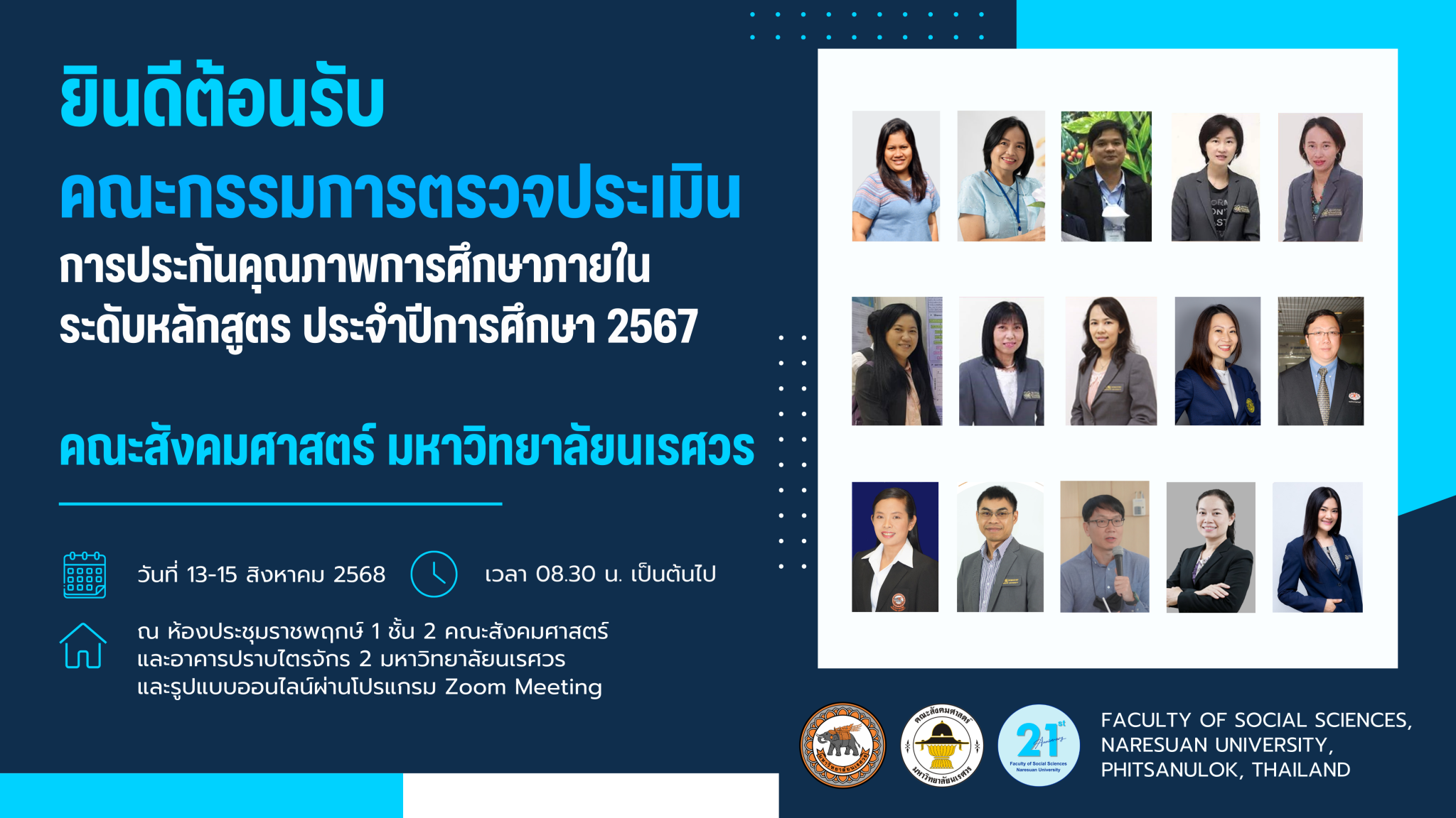 ยินดีต้อนรับคณะกรรมการตรวจประเมินการประกันคุณภาพการศึกษาภายในระดับหลักสูตร ประจำปีการศึกษา 2567คณะสังคมศาสตร์ มหาวิทยาลัยนเรศวร