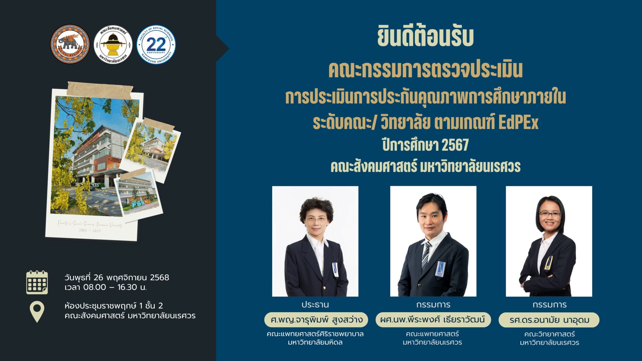 ยินดีต้อนรับคณะกรรมการตรวจประเมินการประเมินการประกันคุณภาพการศึกษาภายในระดับคณะ/ วิทยาลัย ตามเกณฑ์ EdPExปีการศึกษา 2567คณะสังคมศาสตร์ มหาวิทยาลัยนเรศวร