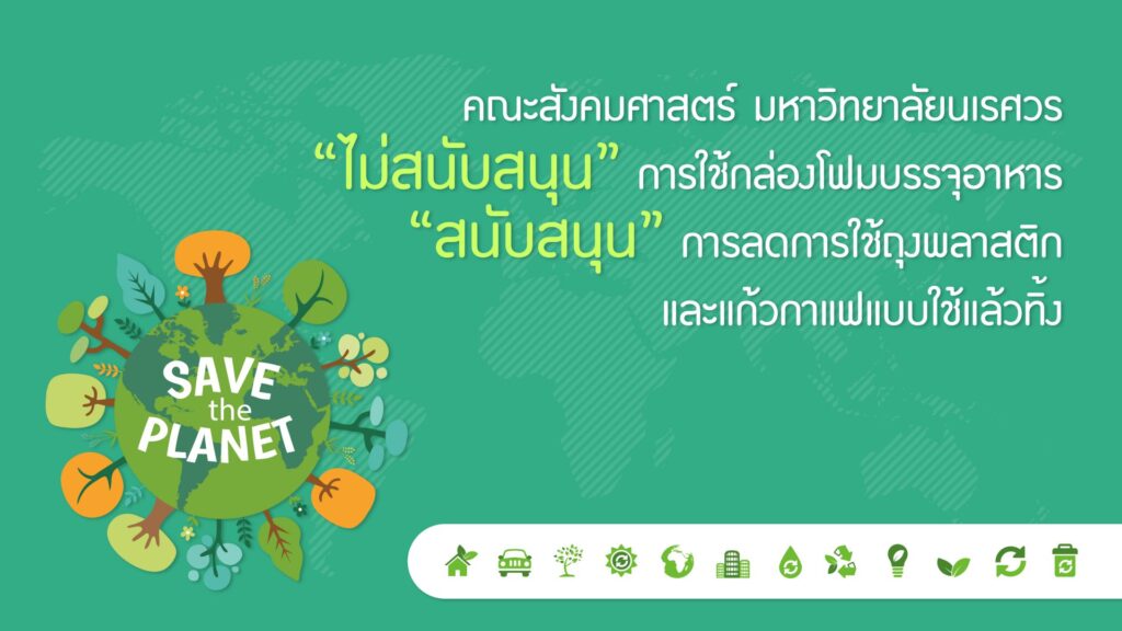 รณรงค์ลดการใช้กล่องโฟมและถุงพาสติก คณะสังคมศาสตร์ มหาวิทยาลัยนเรศวร “ไม่สนับสนุน” การใช้กล่องโฟมบรรจุอาหาร “สนับสนุน” การลดการใช้ถุงพลาสติก และแก้วกาแฟแบบใช้แล้วทิ้ง