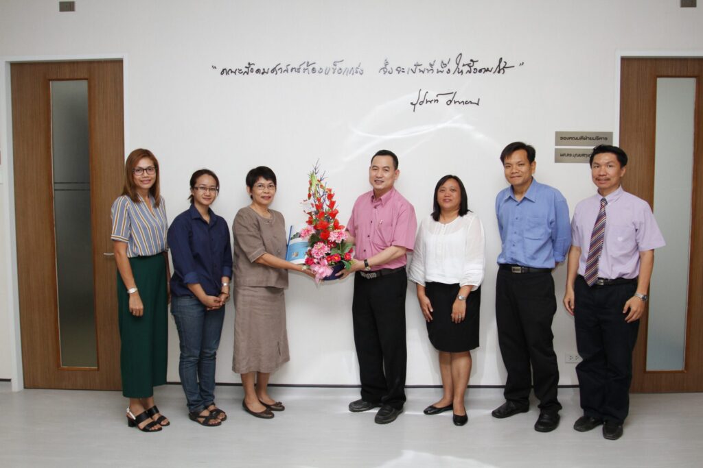 รองศาสตราจารย์ ดร.เดช วัฒนชัยยิ่งเจริญ คณะเกษตรศาสตร์ ทรัพยากรธรรมชาติและสิ่งแวดล้อม เข้ามอบกระเช้าดอกไม้ให้กับ รองศาสตราจารย์ ดร.พัชรินทร์ สิรสุนทร คณบดีคณะสังคมศาสตร์