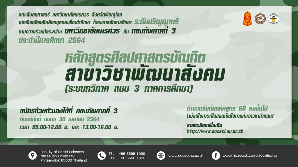 รับสมัครคัดเลือกบุคคลเพื่อเข้าศึกษา โครงการจัดการศึกษาระดับปริญญาตรี ตามความร่วมมือระหว่างมหาวิทยาลัยนเรศวร กับ กองทัพภาคที่ 3 ประจำปีการศึกษา 2564