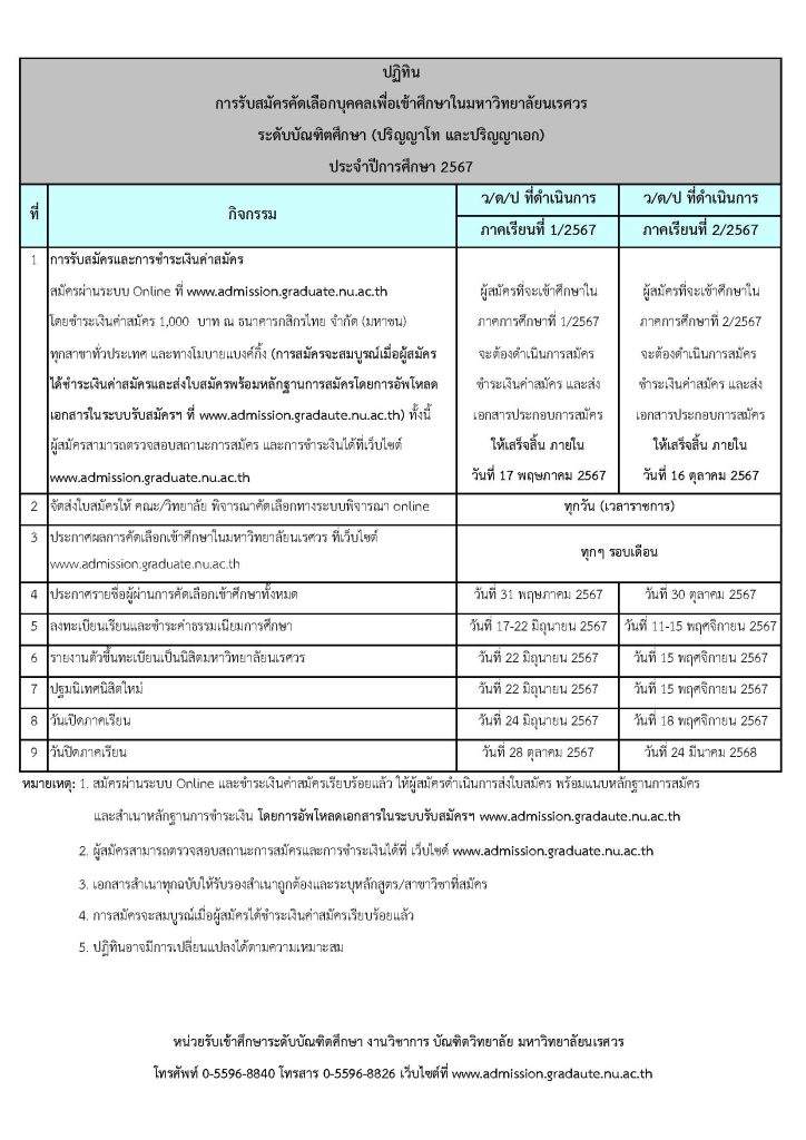 สามารถสมัครเข้าศึกษาได้ที่ https://www.admission.graduate.nu.ac.th/