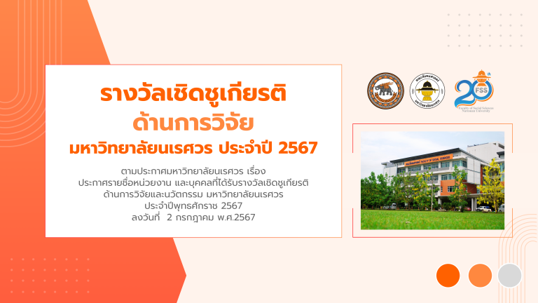 ตามประกาศมหาวิทยาลัยนเรศวรเรื่อง ประกาศรายชื่อหน่วยงาน และบุคคลที่ได้รับรางวัลเชิดชูเกียรติด้านการวิจัยและนวัตกรรม มหาวิทยาลัยนเรศวร ประจำปีพุทธศักราช 2567 ลงวันที่ 2 กรกฎาคม พ.ศ.2567
