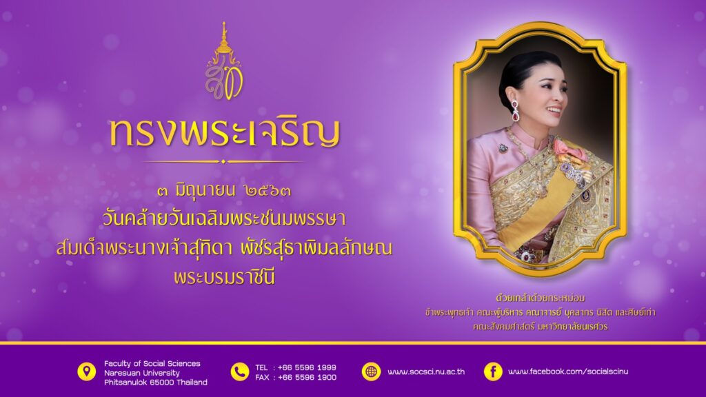 วันคล้ายวันเฉลิมพระชนมพรรษา สมเด็จพระนางเจ้าสุทิดา พัชรสุธาพิมลลักษณ พระบรมราชินี ทรงพระเจริญ ———————————– ๓ มิถุนายน ๒๕๖๓ วันคล้ายวันเฉลิมพระชนมพรรษา สมเด็จพระนางเจ้าสุทิดา พัชรสุธาพิมลลักษณ พระบรมราชินี ————————————- ด้วยเกล้าด้วยกระหม่อม ข้าพระพุทธเจ้า คณะผู้บริหาร คณาจารย์ บุคลากร นิสิต และศิษย์เก่า คณะสังคมศาสตร์ มหาวิทยาลัยนเรศวร