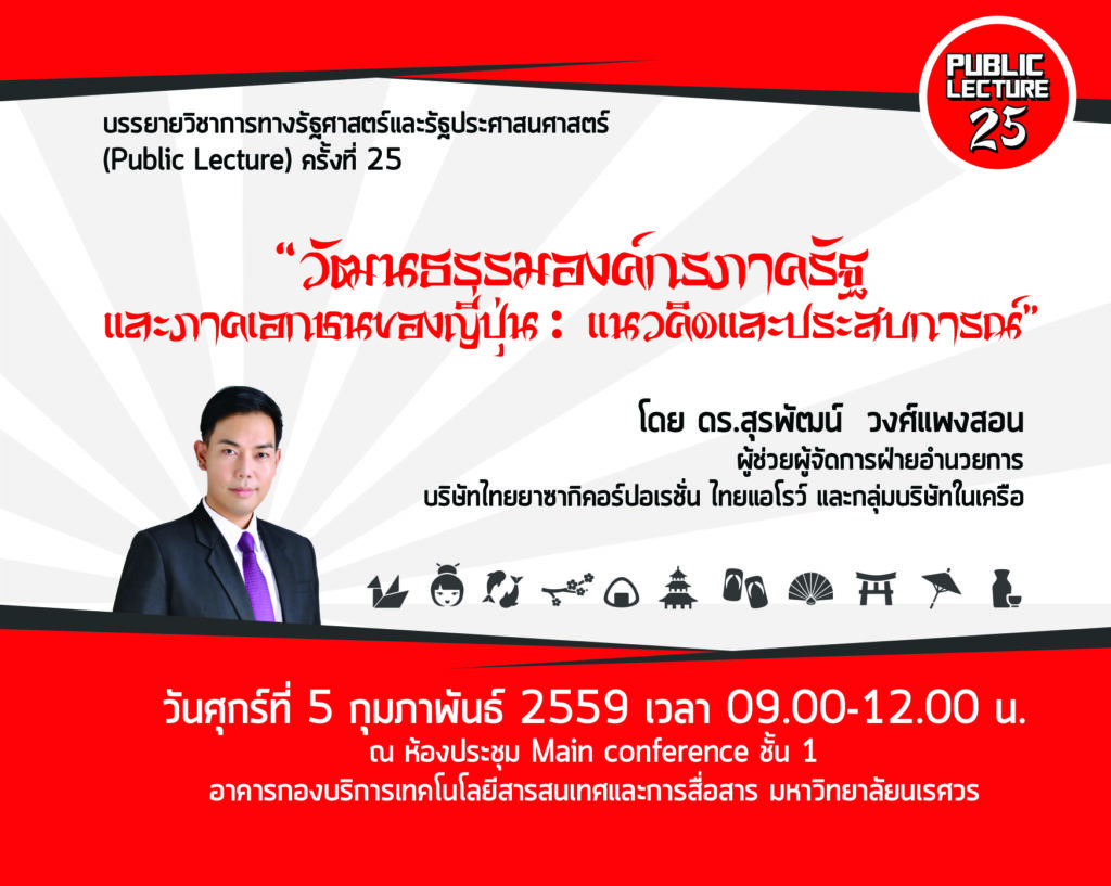 มหาวิทยาลัยนเรศวร โดยภาควิชารัฐศาสตร์และรัฐประศาสนศาสตร์ คณะสังคมศาสตร์ ได้จัดโครงการบรรยายวิชาการทางรัฐศาสตร์และรัฐประศาสนศาสตร์ ครั้งที่ 25 ในหัวข้อเรื่อง “วัฒนธรรมองค์กรภาครัฐและภาคเอกชนของญี่ปุ่น: แนวคิดและประสบการณ์” โดย ดร.สุรพัฒน์ วงศ์แพงสอนผู้ช่วยผู้จัดการฝ่ายอำนวยการ บริษัทไทยยาซากิคอร์ปอเรชั่น ไทยแอโรว์ และกลุ่มบริษัทในเครือ ให้แก่นิสิต คณาจารย์ และประชาชนทั่วไป เมื่อวันศุกร์ที่ 5 กุมภาพันธ์ พ.ศ. 2559 ตั้งแต่เวลา 09.00 – 12.00 น. ณ ห้องประชุม Main Conference ชั้น 1 อาคารกองบริการสารสนเทศและการสื่อสาร มหาวิทยาลัยนเรศวร จังหวัดพิษณุโลก