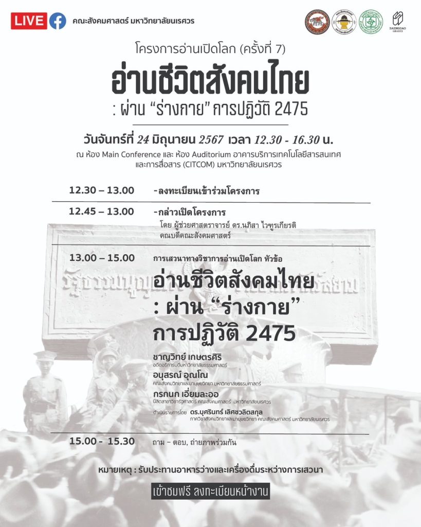 - 13.00 – 15.00 น. – การเสวนาทางวิชาการอ่านเปิดโลก หัวข้อ “อ่านชีวิตสังคมไทย: ผ่าน “ร่างกาย” การปฏิวัติ 2475”