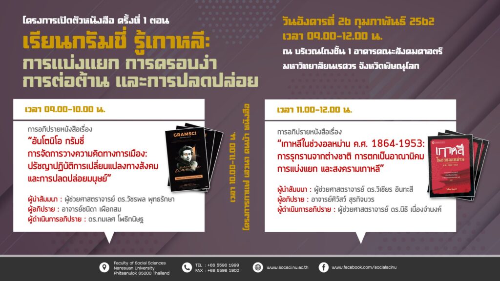 เวลา 09.00–10.00 น.” การอภิปรายหนังสือเรื่อง “อันโตนิโอ กรัมชี่ การจัดการวางความคิดทางการเมือง:ปรัชญาปฏิบัติการเปลี่ยนแปลงทางสังคม และการปลดปล่อยมนุษย์”