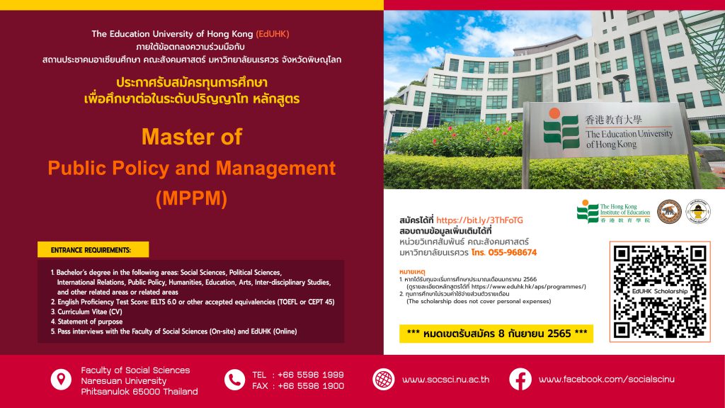 The Education University of Hong Kong (EdUHK) ภายใต้ข้อตกลงความร่วมมือกับ สถานประชาคมอาเซียนศึกษา คณะสังคมศาสตร์ มหาวิทยาลัยนเรศวร จังหวัดพิษณุโลก เปิดรับผู้สนใจสมัครเข้ารับทุนการศึกษาเพื่อศึกษาต่อในระดับปริญญาโท หลักสูตร
