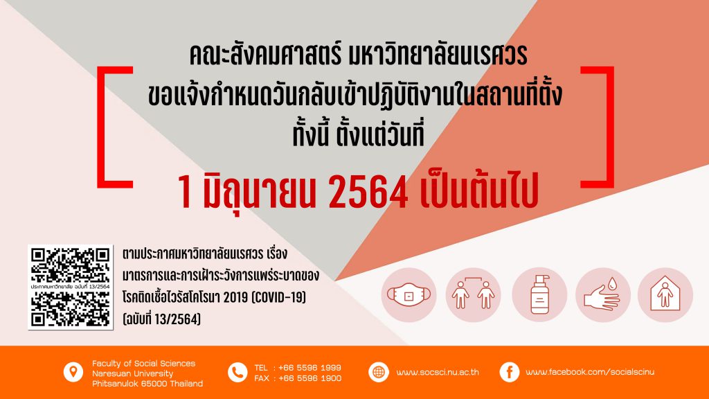 คณะสังคมศาสตร์ มหาวิทยาลัยนเรศวร ขอแจ้งกำหนดวันกลับเข้าปฏิบัติงานในสถานที่ตั้ง