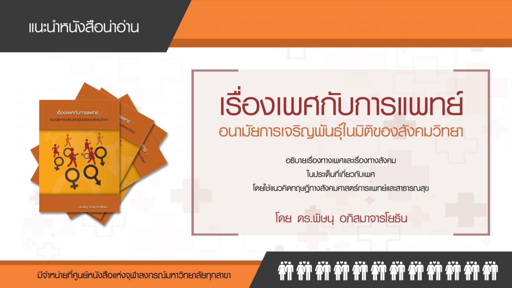 แนะนำหนังสือน่าอ่าน:เรื่องเพศกับการแพทย์ อนามัยการเจริญพันธ์ุในมิติของสังคมวิทยา อธิบายเรื่องทางเพศและเรื่องทางสังคม ในประเด็นที่เกี่ยวกับเพศ โดยใช้แนวคิดทฤษฎีทางสังคมศาสตร์การแพทย์และสาธารณสุข โดย ดร.พิษณุ อภิสมาจารโยธิน มีจำหน่ายที่ศูนย์หนังสือแห่งจุฬาลงกรณ์มหาวิทยาลัยทุกสาขา