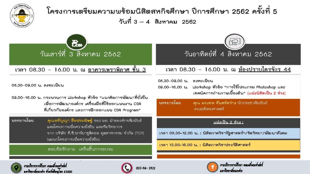 โครงการเตรียมความพร้อมนิสิตสหกิจศึกษา ปีการศึกษา 2562 ครั้งที่ 5 โครงการเตรียมความพร้อมนิสิตสหกิจศึกษา ปีการศึกษา 2562 ครั้งที่ 5 วันที่ 3 – 4 สิงหาคม 2562 เวลา 08.30 – 16.00 น.