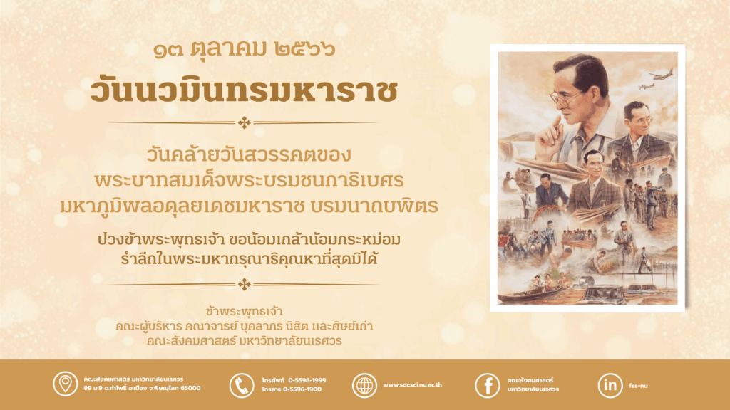 ๑๓ ตุลาคม ๒๕๖๖ “วันนวมินทรมหาราช” วันคล้ายวันสวรรคตของพระบาทสมเด็จพระบรมชนกาธิเบศร มหาภูมิพลอดุลยเดชมหาราช บรมนาถบพิตร ๑๓ ตุลาคม ๒๕๖๖ “วันนวมินทรมหาราช” วันคล้ายวันสวรรคตของพระบาทสมเด็จพระบรมชนกาธิเบศร มหาภูมิพลอดุลยเดชมหาราช บรมนาถบพิตร ปวงข้าพระพุทธเจ้า ขอน้อมเกล้าน้อมกระหม่อม รำลึกในพระมหากรุณาธิคุณหาที่สุดมิได้ ข้าพระพุทธเจ้า คณะผู้บริหาร คณาจารย์ บุคลากร นิสิต และศิษย์เก่า คณะสังคมศาสตร์ มหาวิทยาลัยนเรศวร