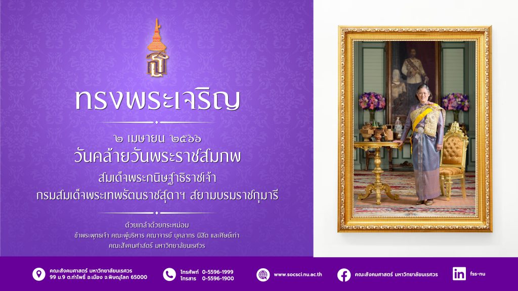 ๒ เมษายน ๒๕๖๖ วันคล้ายวันพระราชสมภพ สมเด็จพระกนิษฐาธิราชเจ้า กรมสมเด็จพระเทพรัตนราชสุดาฯ สยามบรมราชกุมารี “ทรงพระเจริญ” ๒ เมษายน ๒๕๖๖ วันคล้ายวันพระราชสมภพ สมเด็จพระกนิษฐาธิราชเจ้า กรมสมเด็จพระเทพรัตนราชสุดาฯ สยามบรมราชกุมารี ด้วยเกล้าด้วยกระหม่อม ข้าพระพุทธเจ้า คณะผู้บริหาร คณาจารย์ บุคลากร นิสิต และศิษย์เก่า คณะสังคมศาสตร์ มหาวิทยาลัยนเรศวร