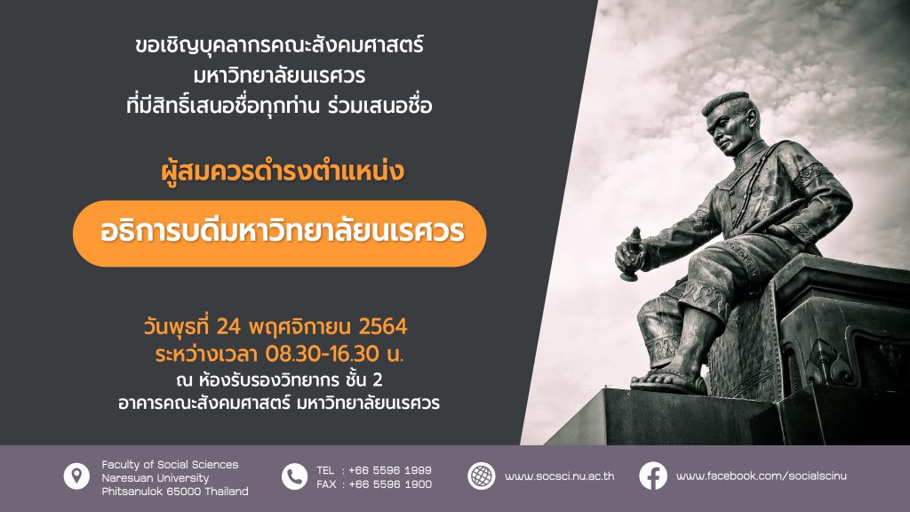 การเสนอชื่อ “ผู้สมควรดำรงตำแหน่งอธิการบดีมหาวิทยาลัยนเรศวร” ขอเชิญบุคลากรคณะสังคมศาสตร์ มหาวิทยาลัยนเรศวร ที่มีสิทธิ์เสนอชื่อทุกท่าน ร่วมเสนอชื่อ “ผู้สมควรดำรงตำแหน่งอธิการบดีมหาวิทยาลัยนเรศวร” วันพุธที่ 24 พฤศจิกายน 2564 ระหว่างเวลา 08.30-16.30 น. ณ ห้องรับรองวิทยากร ชั้น 2 อาคารคณะสังคมศาสตร์ มหาวิทยาลัยนเรศวร