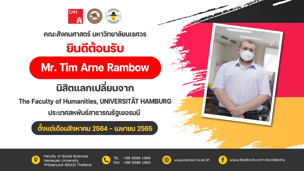 คณะสังคมศาสตร์ มหาวิทยาลัยนเรศวร ยินดีต้อนรับนิสิตแลกเปลี่ยน Mr. Tim Arne Rambow The Faculty of Humanities, UNIVERSITÄT HAMBURG ประเทศสหพันธ์สาธารณรัฐเยอรมนี